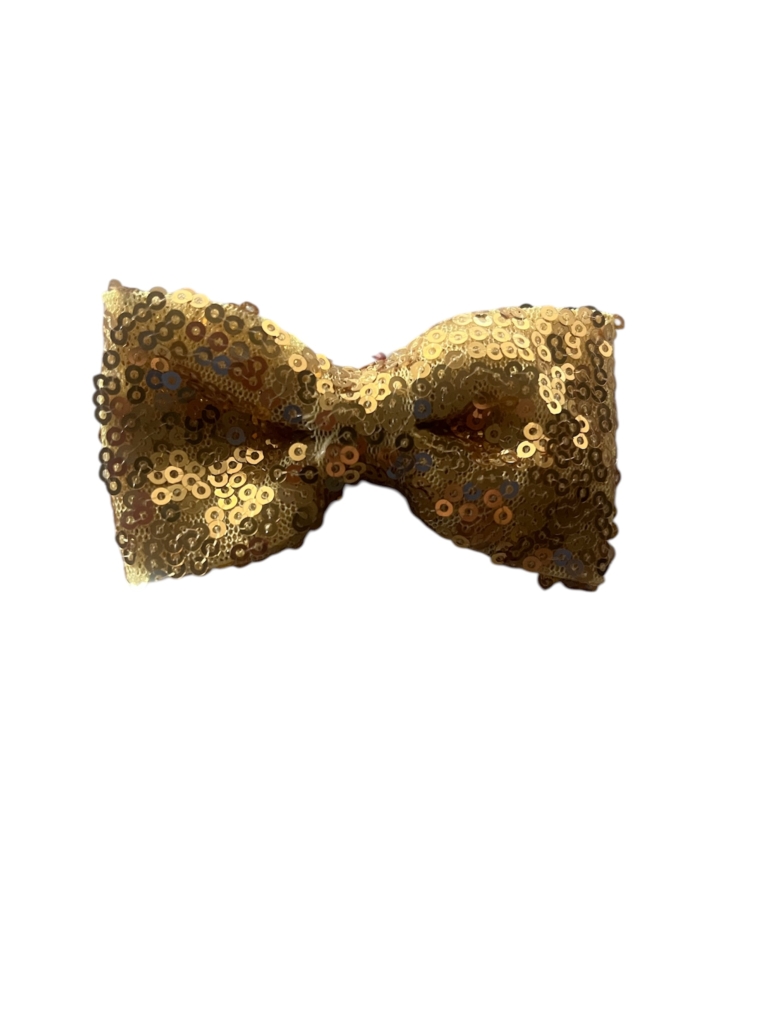 Son lazos con lentejuelas, no tiene prensa, mide 8.5cm de largo, color dorado oscuro